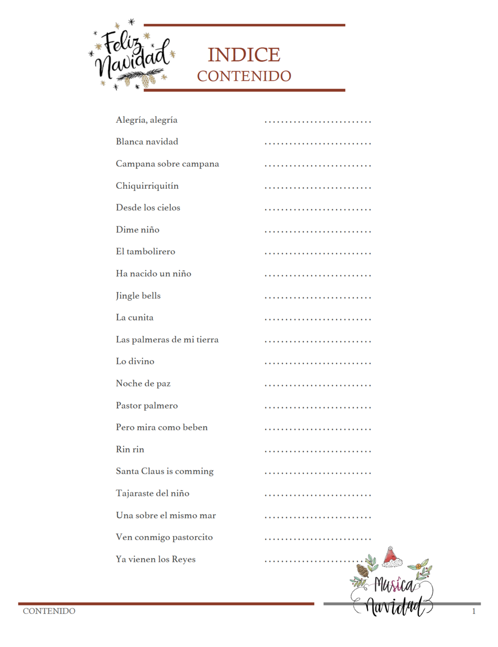 Contiene: 1.- Alegría, alegría. 2.- Blanca navidad. 3.- Campana sobre campana. 4.-Chiquirriquitín. 5.- Desde los cielos. 6.-Dime niño. 7.-El tamborilero. 8.-Ha nacido un niño. 9.-Jingle Bells. 10.-La cunita. 11.-Las palmeras de mi tierra. 12.-Lo divino. 13.-Noche de paz. 14.-Pastor palmero. 15.-Pero mira como beben. 16.-Rin Rin. 17.-Santa Claus is coming. 18.-Tajaraste del niño. 19.-Una sobre el mismo mar. 20.-Ven conmigo pastorcito. 21.-Ya vienen los reyes.